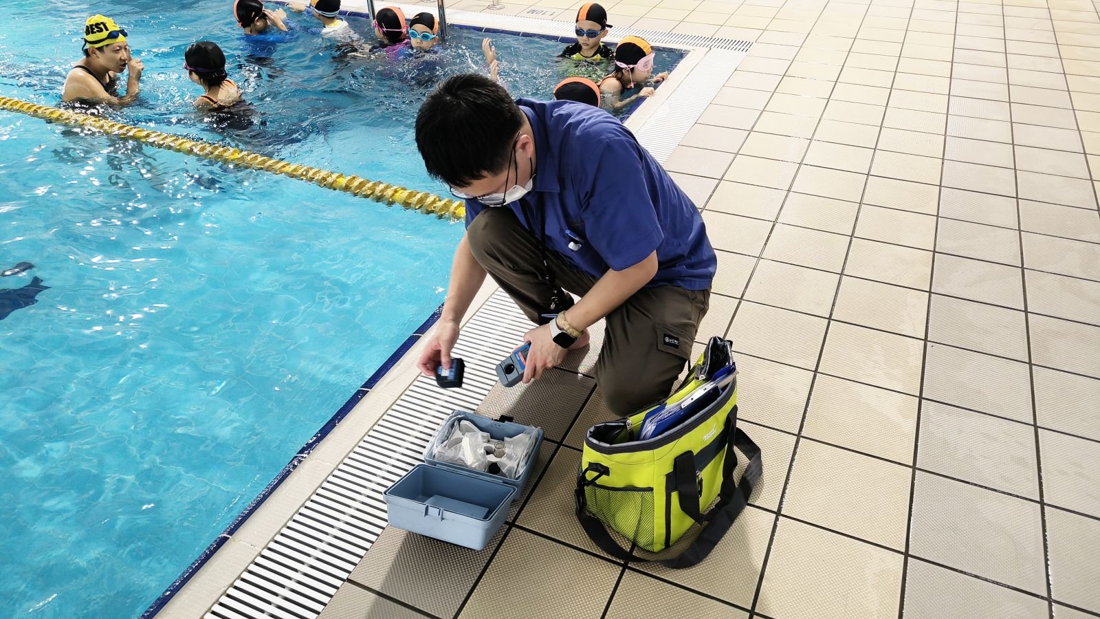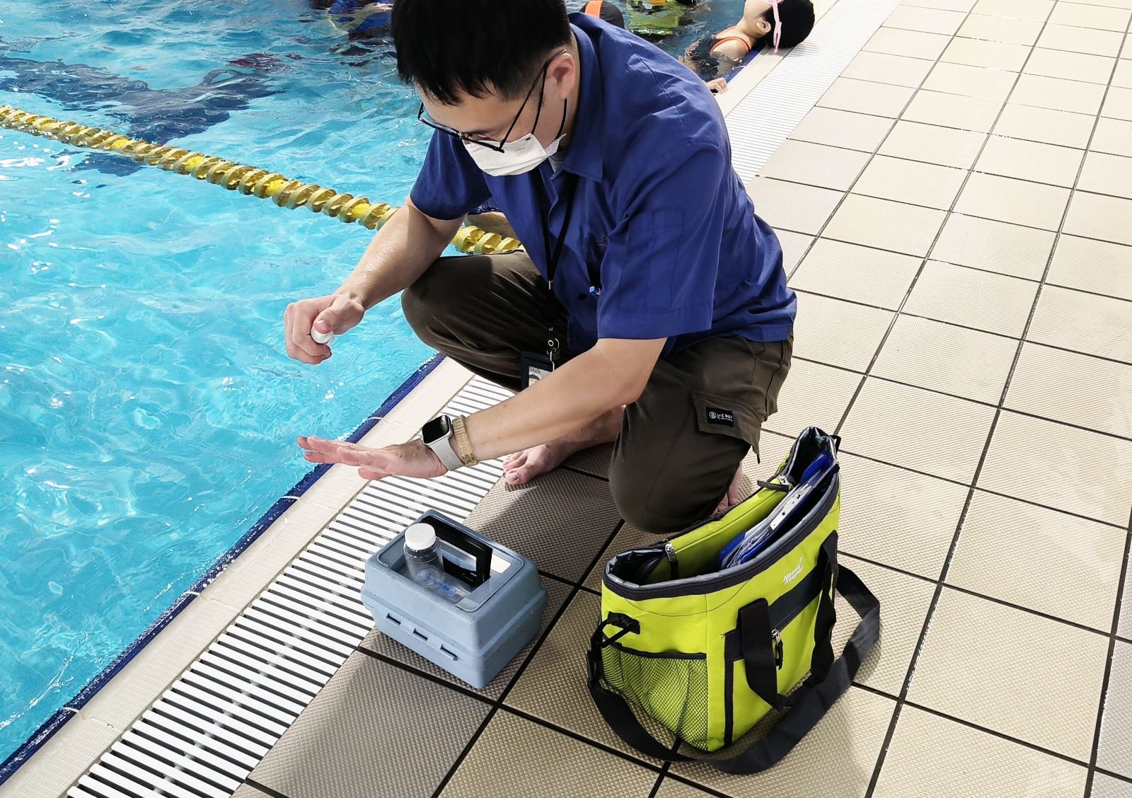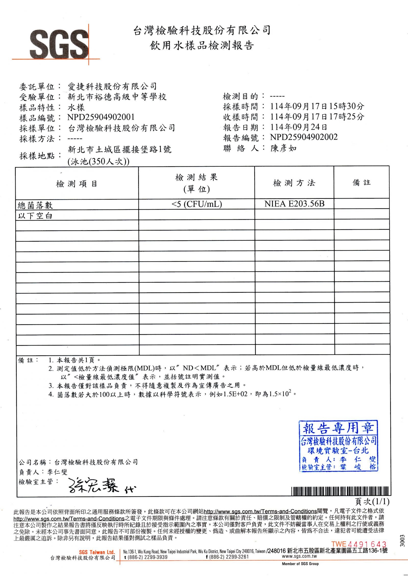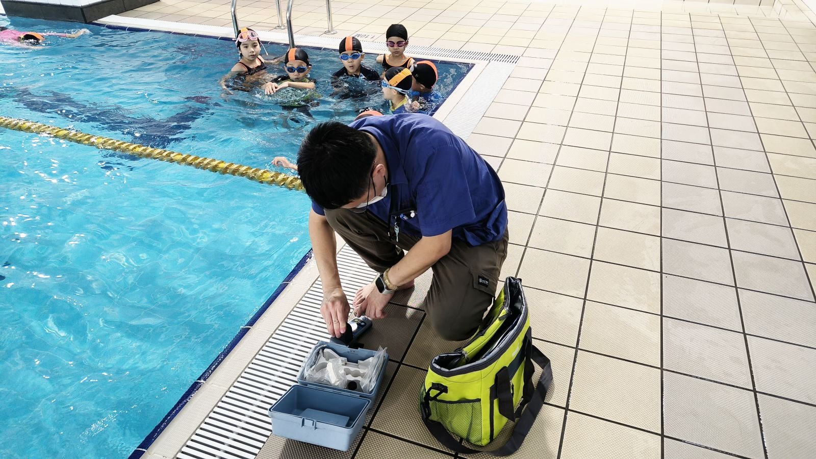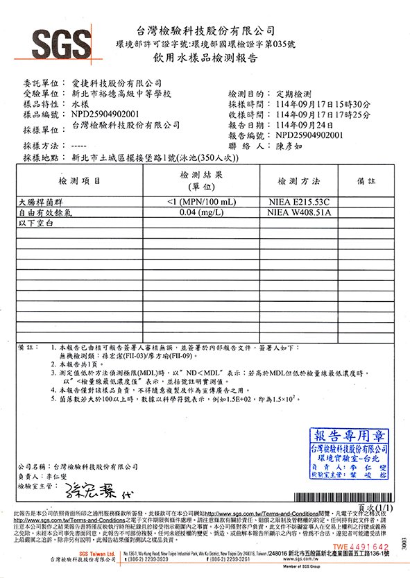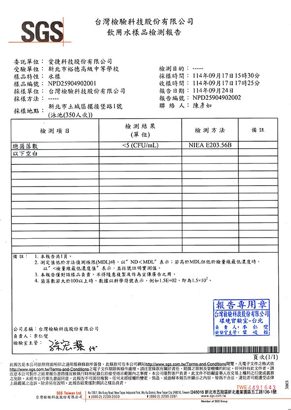 经第三方认证单位SGS台湾检验科技派员至裕德中学泳池取水采样,而当日泳池约为350人次,