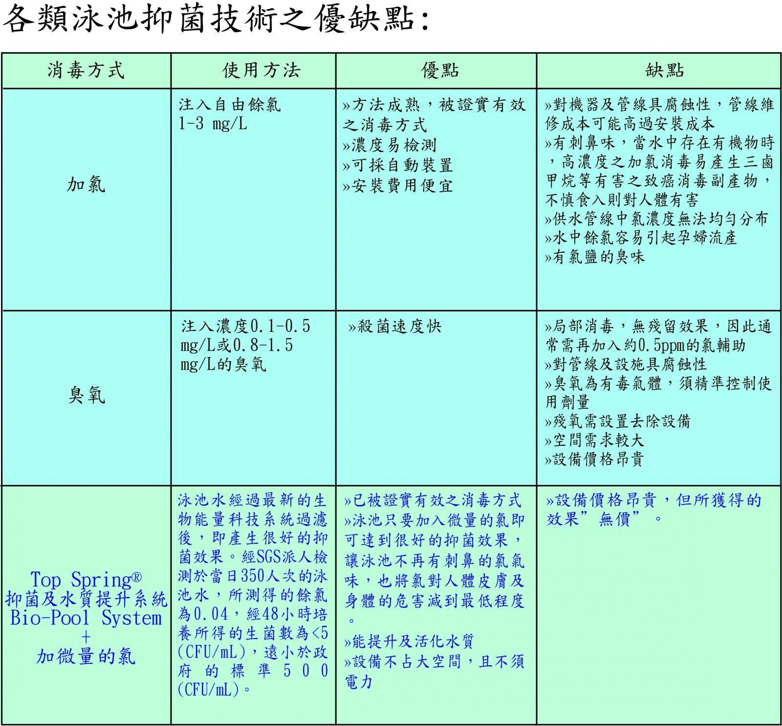 能让泳池的空气及水质达到前所未有的好,并保护泳客的身体健康! 经SGS公司现场采样,而当日泳池约为350人次, 所测得结果为泳池水的余氯为0.04ppm ,总菌落数<5,大肠杆菌<1 (为正常)。